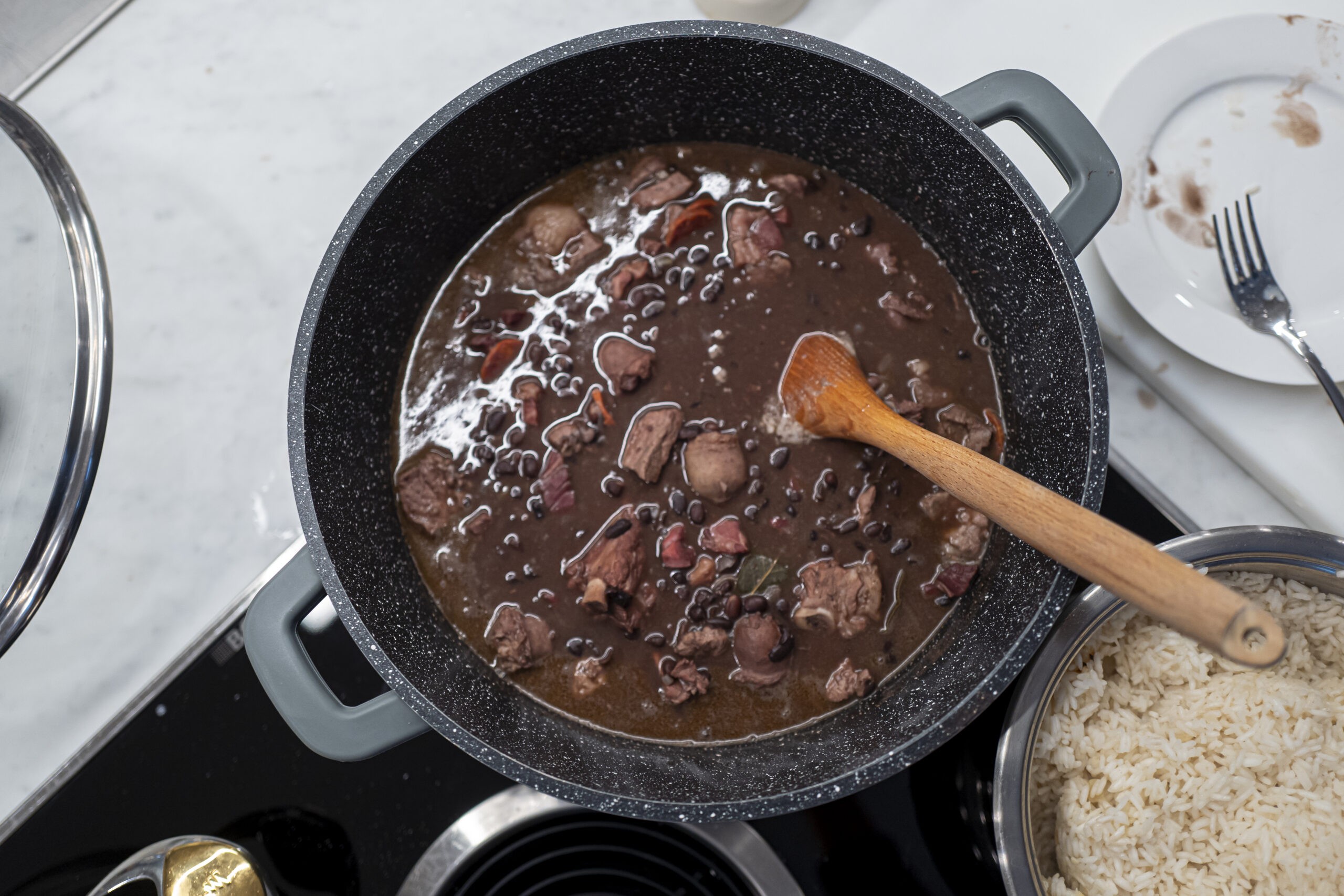 - Feijoada (riso bianco, fagioli neri, cavolo, cipolla, aglio, alloro, carne di maiale)